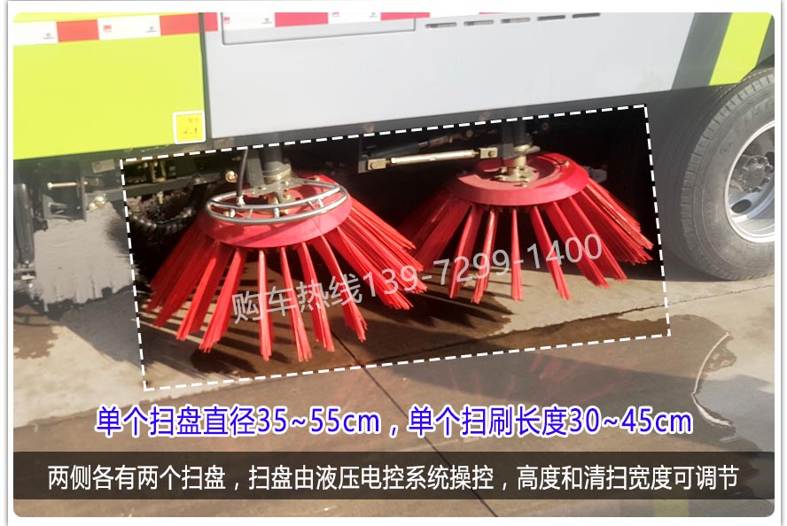 二、上裝配置: 標配掃盤4把;掃盤轉速實現獨立3檔調速;大力馬達;施耐德控件開關;臺灣液壓閥;皖液液壓油泵;新西山水泵;免維護自分離式離合器;免維護風機;不銹鋼水箱;不銹鋼垃圾箱;尾部LED箭頭燈;手動泵應急系統;前掃刷臂轉動機構使用高新耐磨工程隔套,免打黃油;精密冷彎無縫液壓油管。