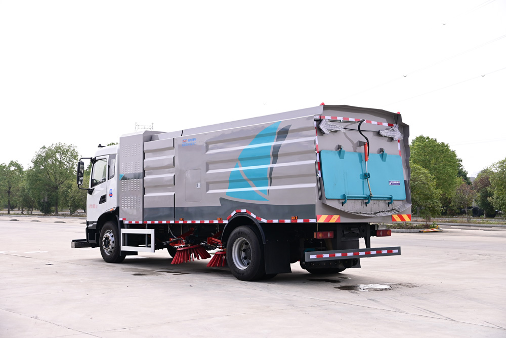四、其他說明: 1.采用吸掃混合的方式收集垃圾,濕式除塵、電液控制,液壓傾翻卸料的作業(yè)方式對路面進(jìn)行清掃作業(yè)。 2. 采用永磁同步電機專門驅(qū)動風(fēng)機和液壓系統(tǒng),保證行駛過程中能繼續(xù)工作,保證清掃過程的連續(xù)性。