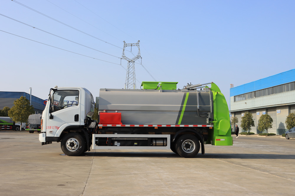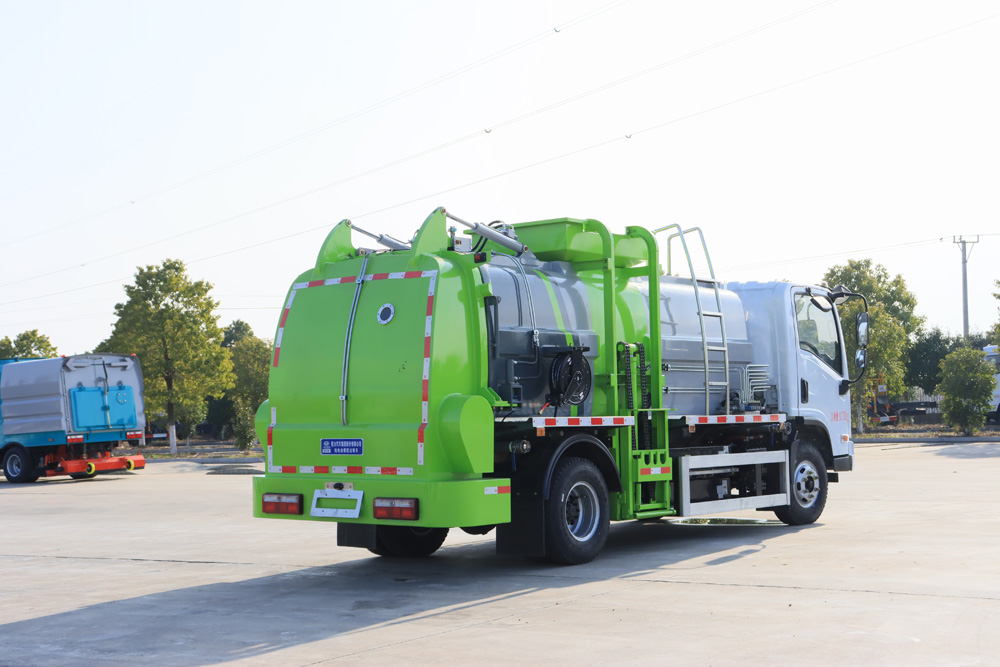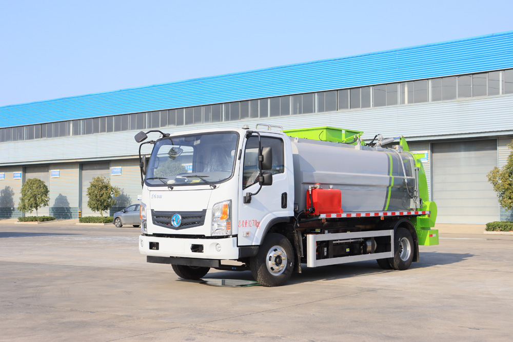 四、其他說明: 東風純電動餐廚垃圾車是在東風純電動二類底盤的基礎上,加裝垃圾箱、垃圾桶提升機、清洗裝置、液 壓系統,由機械、液壓(氣路)、電器三部分合為一體的專用廚余垃圾處理、轉運作業車。 工作原理:整車為全密封型,自行壓縮、自行傾倒、壓縮過程中的污水全部進入污水箱,徹底的解決了 垃圾運輸過程中的二次污染,具有壓力大、密封性好、操作方便。安全等優點。垃圾箱可實現箱內餐廚垃圾 固液的初步分離,并采用大容積污水箱,提高產品裝載量; 電控系統采用無線遙控,并通過作業動作邏輯互 鎖,保證操作的精準性,杜絕誤操作。