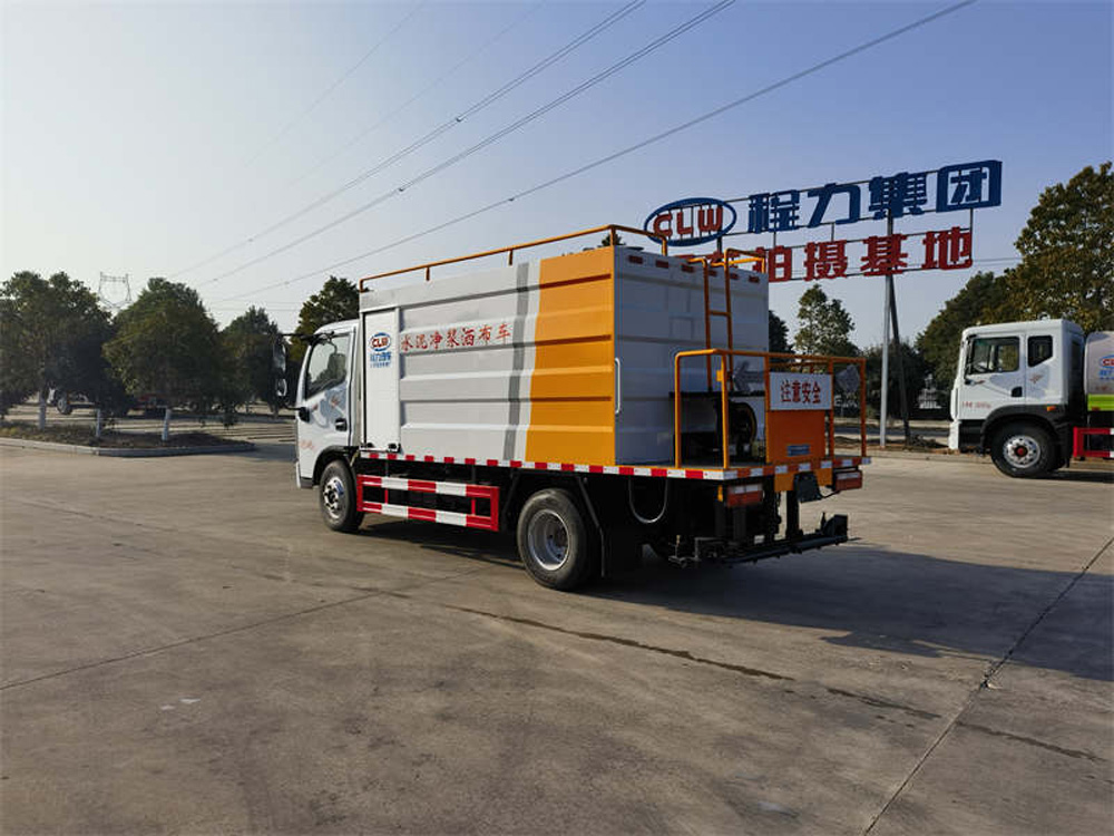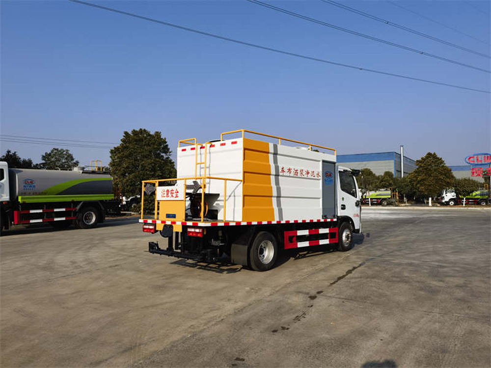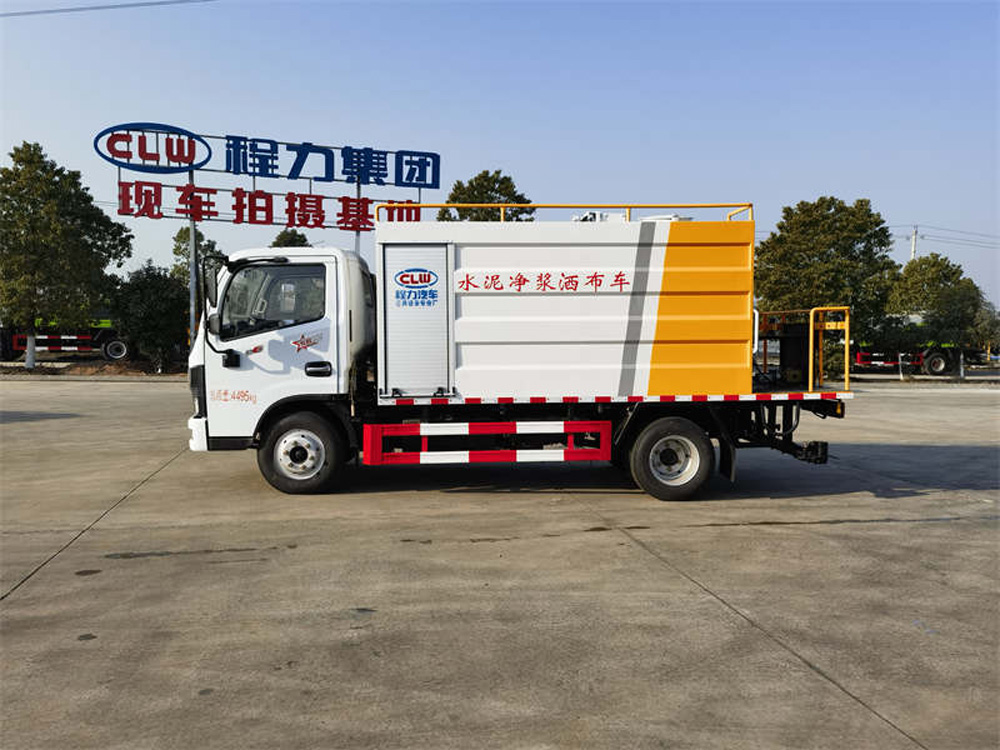 該車特點 水泥罐、清水罐采用 Q235 優質碳鋼制作,高壓水泵,水泥砂漿泵(專用),攪拌系統,液壓系統,15 米高壓清洗管道(帶卷盤、手持清洗槍),尾部 13 個水泥漿專用噴頭,最大灑布寬度 4 米。其它配置常規,可選裝袋裝水泥提升裝置(用于袋裝水泥向罐體頂部運輸)。