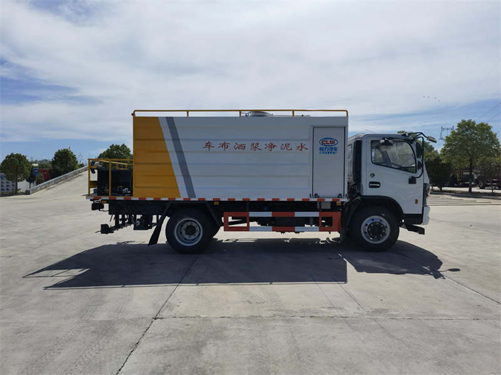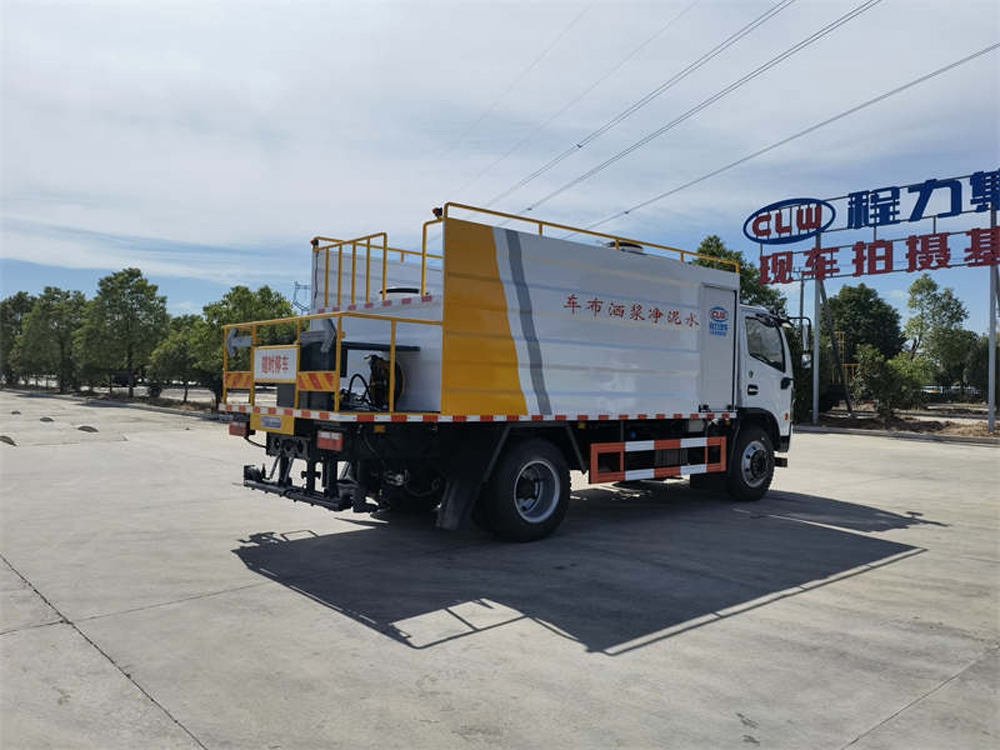 該車特點 水泥罐、清水罐采用 Q235 優質碳鋼制作,高壓水泵,水泥泵(專用),攪拌系統,液壓系統,水罐到攪拌罐供 水系統(渣漿泵),15 米高壓清洗管道(帶卷盤、手持清洗槍),減速分動箱(車輛在行駛工作過程中將車速減慢 從而達到更加理想的灑布效果),尾部 14 個水泥漿專用噴頭,最大灑布寬度 4 米。標配水罐向攪拌罐供水系統,標 配提升裝置(用于袋裝水泥向罐體頂部運輸)。